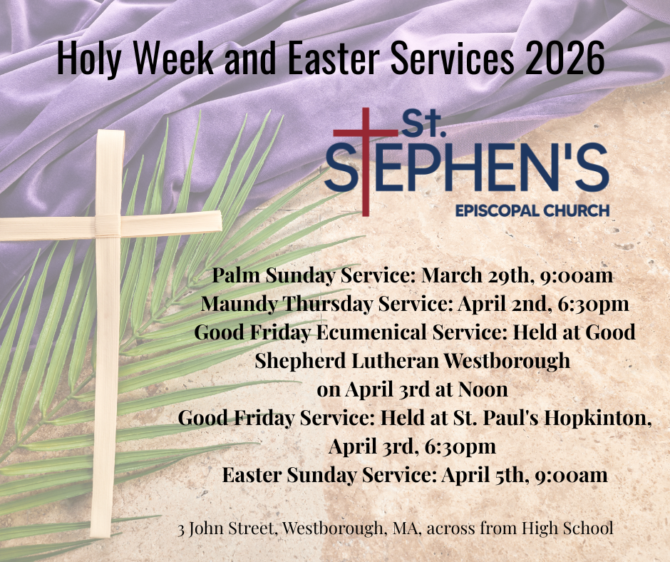 Lenten Study will be held this year at St. Paul's Hopkinton, 61 Wood St., Hopkinton, MA on Wednesdays, March 4 - March 25, 2026 at 6:00pm. Click here to learn more!